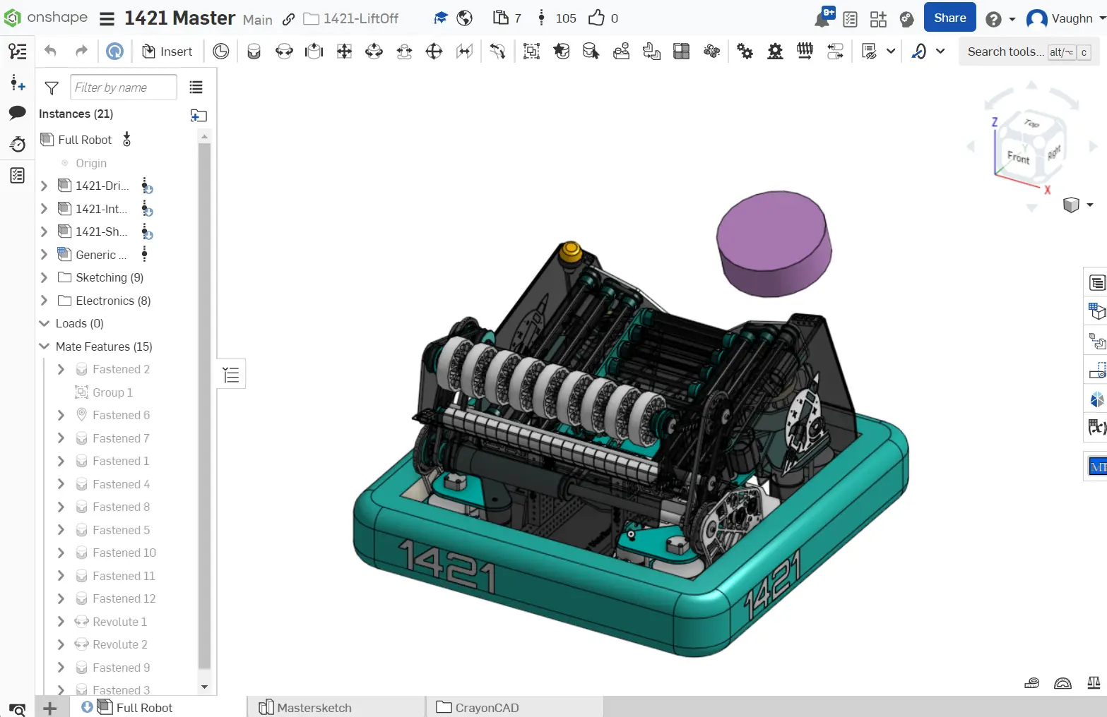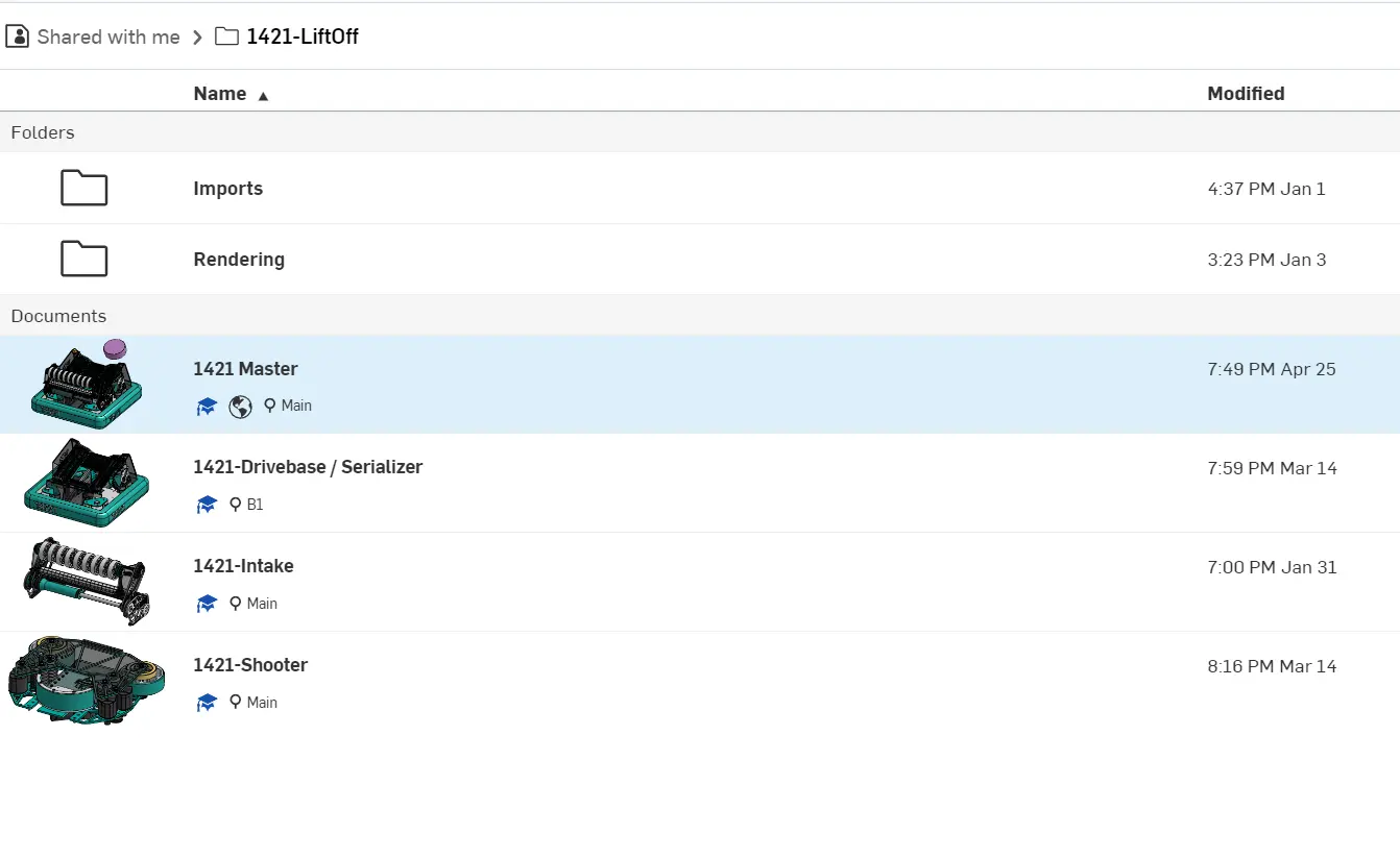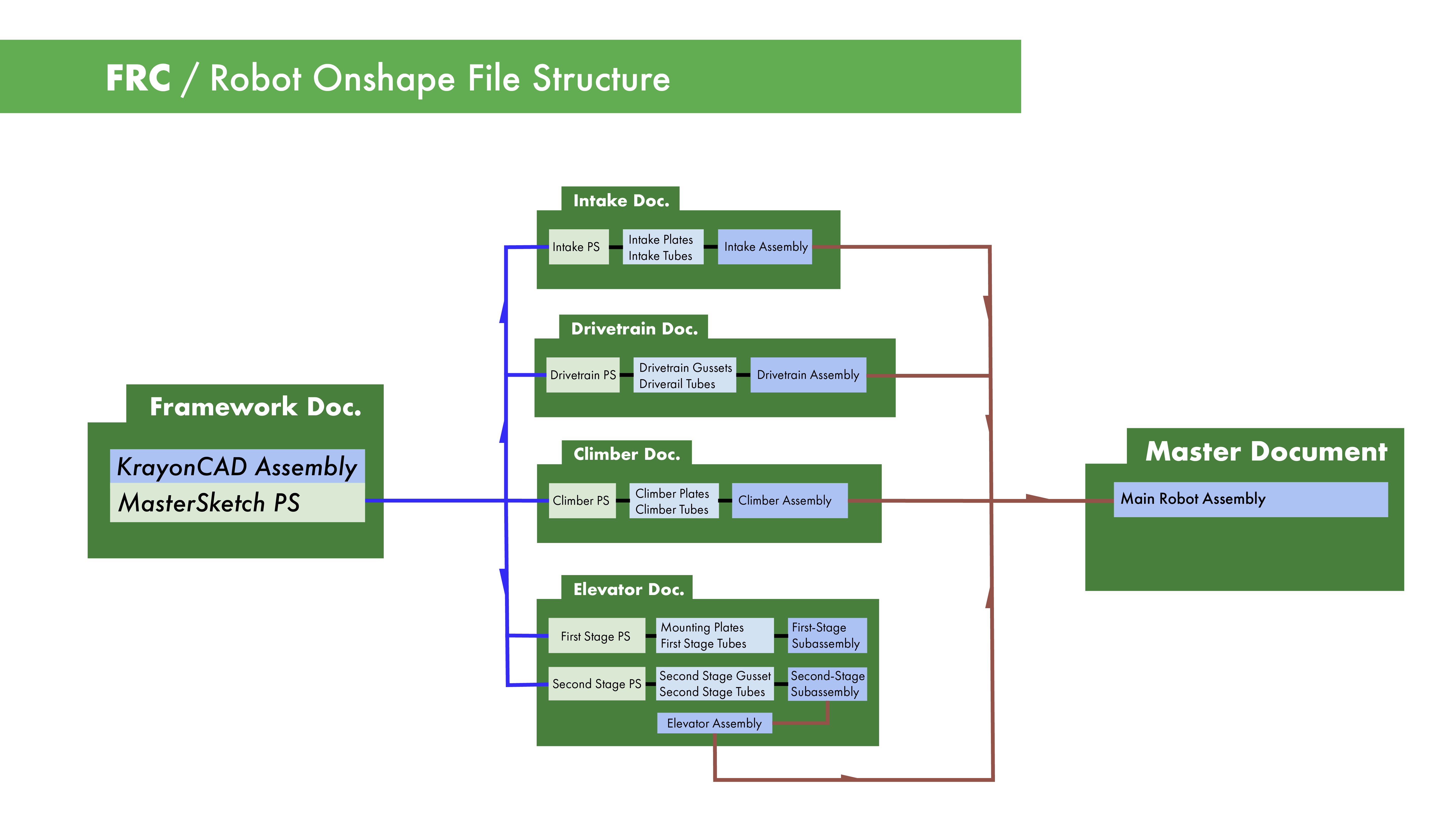 - Several "Subsystem" documents, which contain the part studios, subassemblies and top-level assembly for each subsystem, such as an Intake