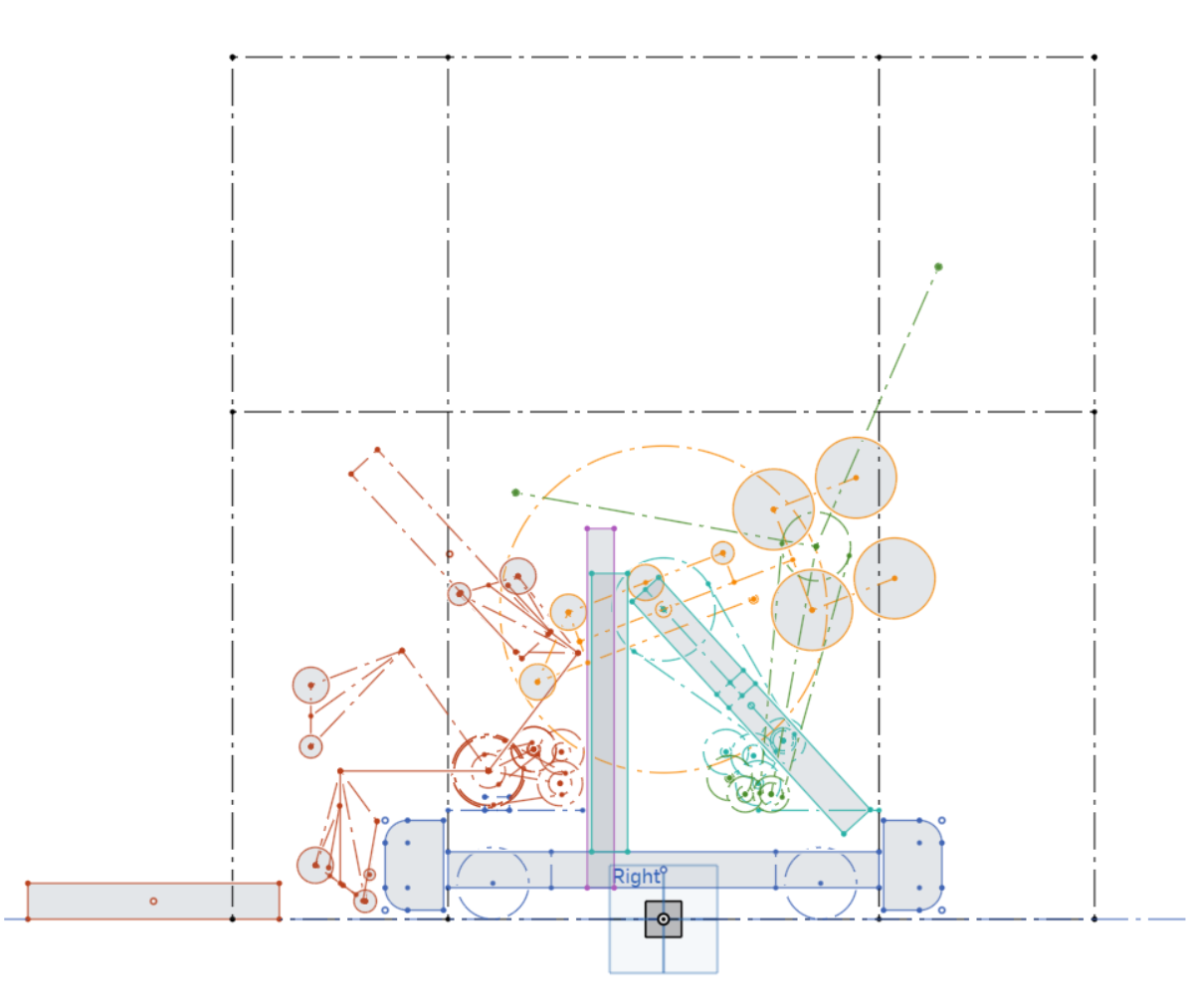 Main layout sketches always start with your drivetrain, bumpers, initial configuration, and extension limits. Field elements are sketched next. You can use hard alignment against bumpers to ensure your geometry can score pieces without much software or mechanical complexity.