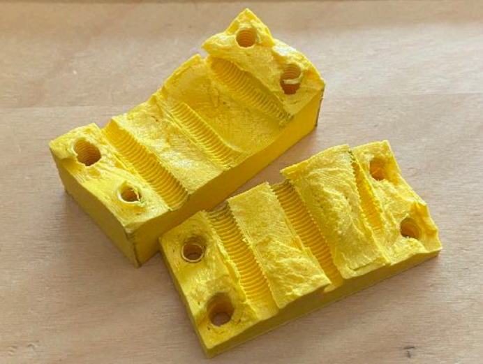 Sometimes 3D prints might not be strong enough on their own to withstand high force applications. One option is to surround a print with metal plates for bolts to clamp on to. This distributes the load of the bolts and keeps the print compressed together, reducing the chance of it breaking.