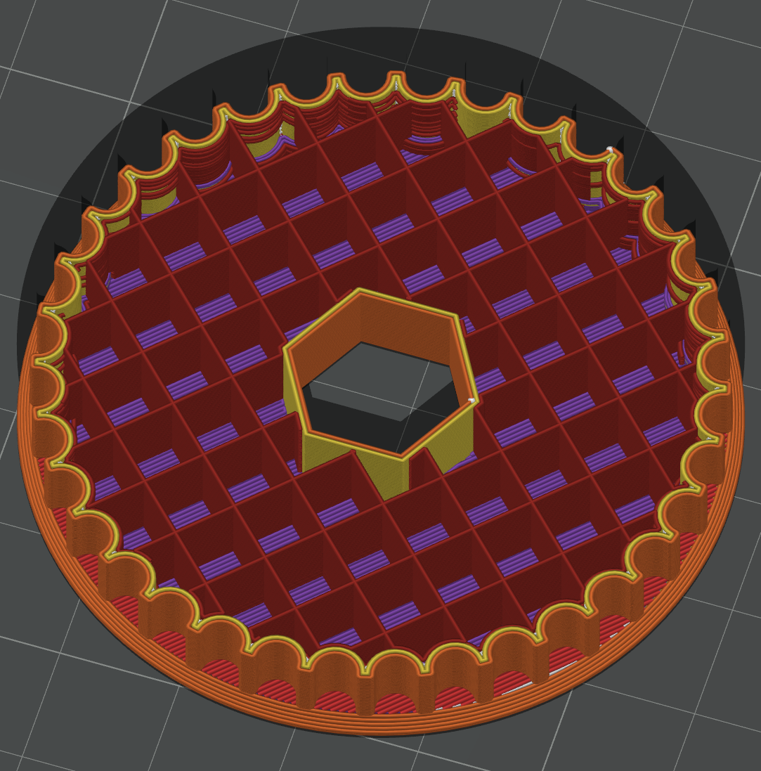 Infill: Power transmission parts may need to be printed with more walls and higher infill percentage (density of the inside of the part). Depending on the use case it might even be necessary to print at 100% infill. Using lower infill will decrease print time and decrease weight, but might increase risk of the part breaking.