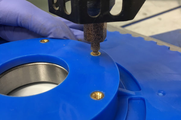 Threading Into Parts: It may be desirable to have an enclosure or other parts that can be bolted together with threads in the part. However, after a few cycles of threading and removing a bolt the soft plastic threads will likely wear out. One alternative is to use a heat stake insert. These inserts are placed in a hole in the print and melted into the plastic using a soldering iron or specialized heater. Once the plastic cools it retains the insert and prevents it from rotating when tightening a bolt.