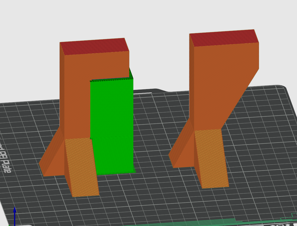 The part on the left with an overhang held up by support material (green) uses 23% more filament to print than the part with extra geometry added on the right. Additionally the part on the right will be stronger because the overhanging feature is better supported.