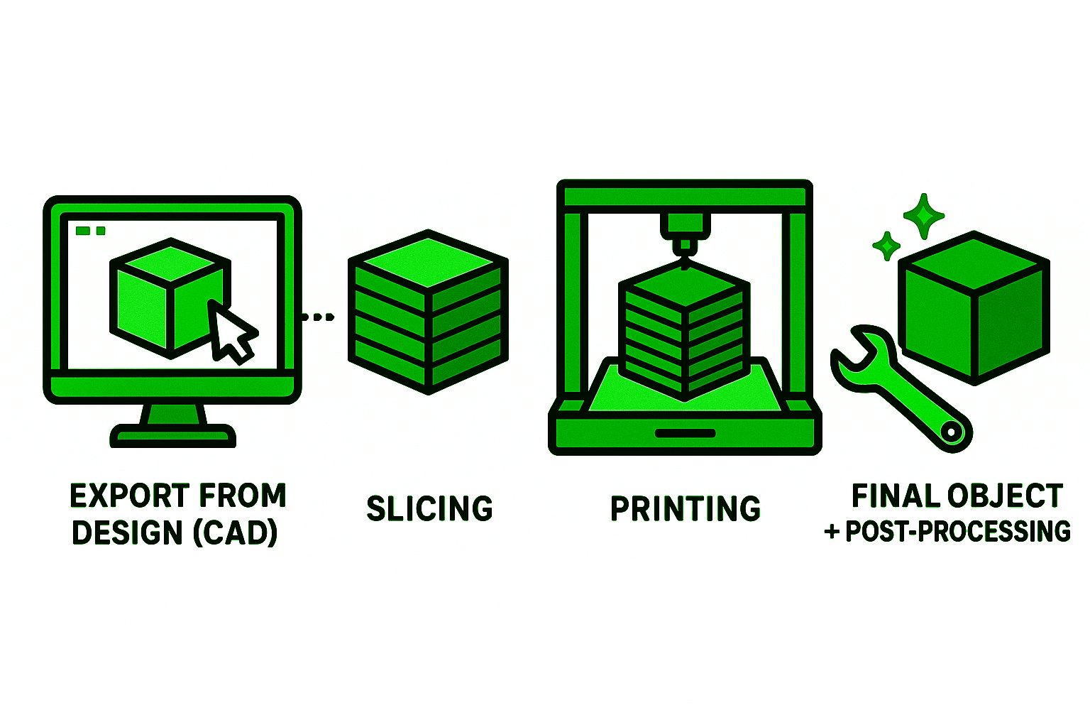 - Post-Processing After printing, some parts may need further work. Post processing can include removing support structures, sanding, painting, or assembling multiple printed components.