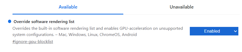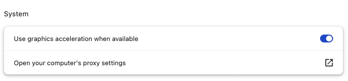 in your search bar to navigate to chrome settings. Make sure that "Use graphics acceleration when available" is enabled. Relaunch chrome if you have updated it to enable it.