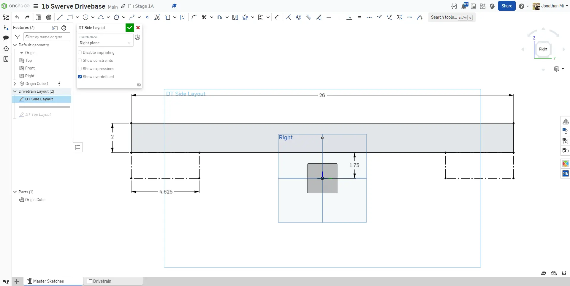 1. Draw the side profile of the drivetrain on the Right Plane. We place the tube 1.75" from the ground, which is the offset from the ground to the bottom of the tube for the MK4i modules.