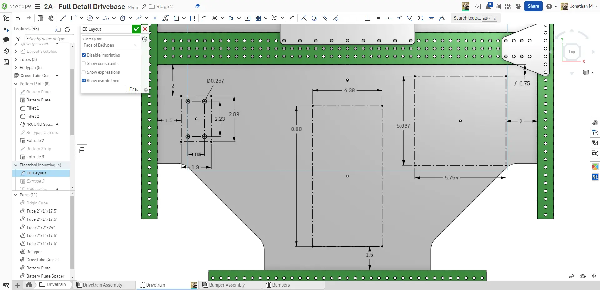 Featurescript can be very useful for generating the mounting holes for electronics. If you cannot accurately manufacture mounting holes for electronics, VHB tape (which comes in the Kit of Parts) can be a good option for robustly securing your electronics.