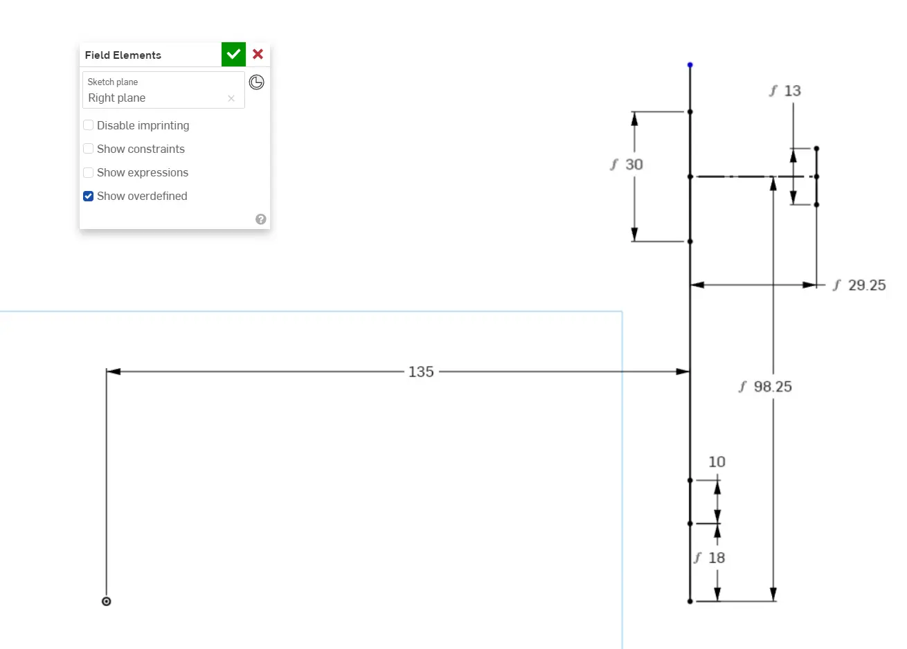 - Sketch any field elements you intend to interact with. There's no hard alignment, but you intend to shoot into the back goal of the "Power Port," so you must sketch that from a side view using the game manual and field layout drawings for reference. Place it 135 inches away from the origin, as that places the center of your robot 15 inches away from the white "initiation line"