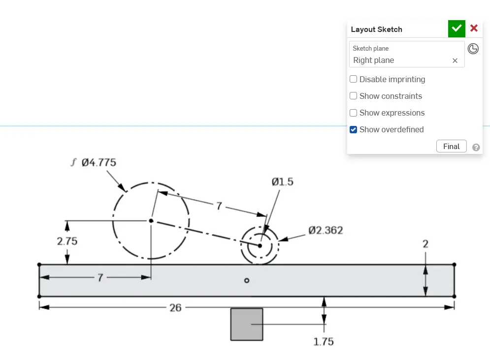 - Create construction circles to represent the pitch circles of both sprockets and the diameter of the motor.
