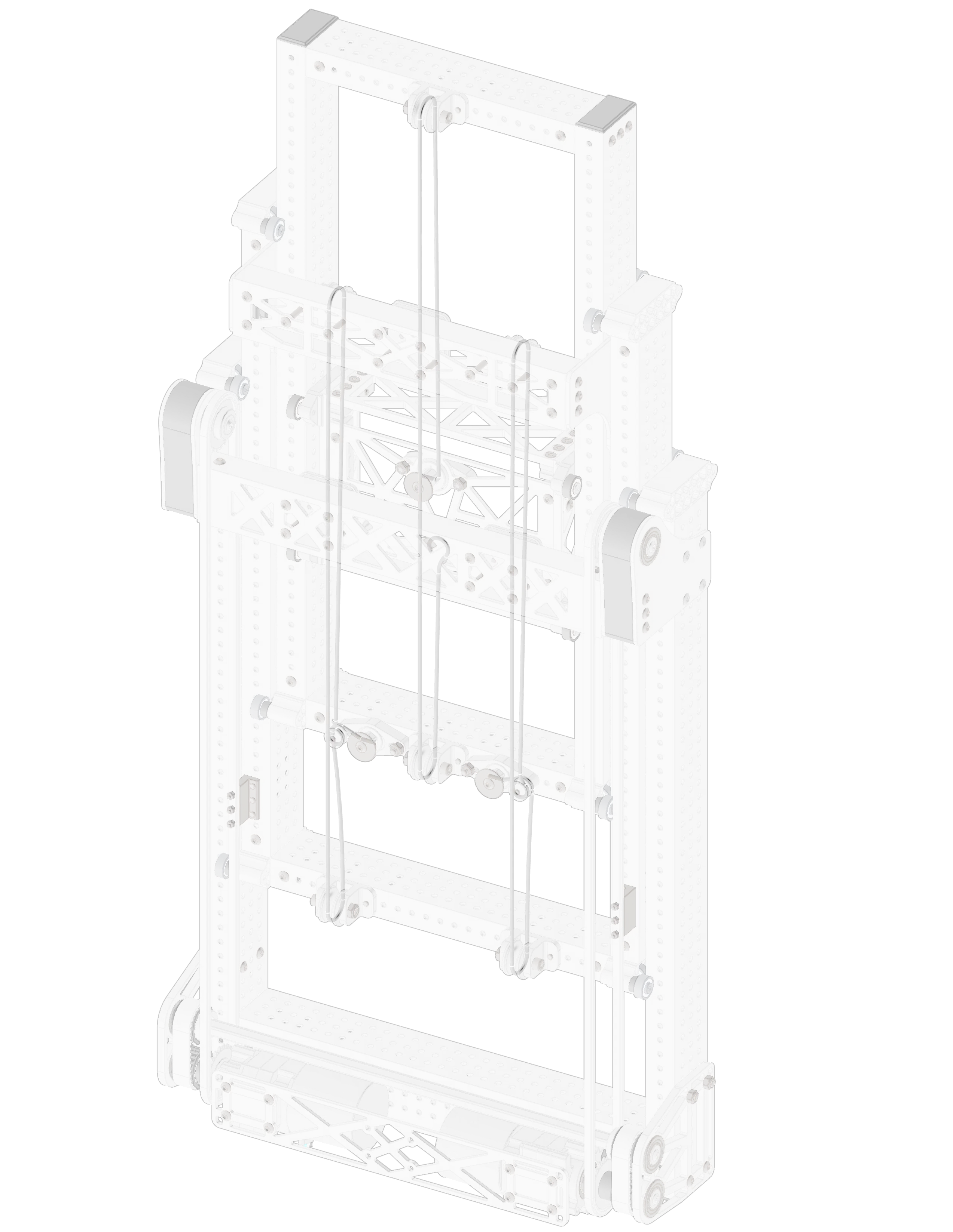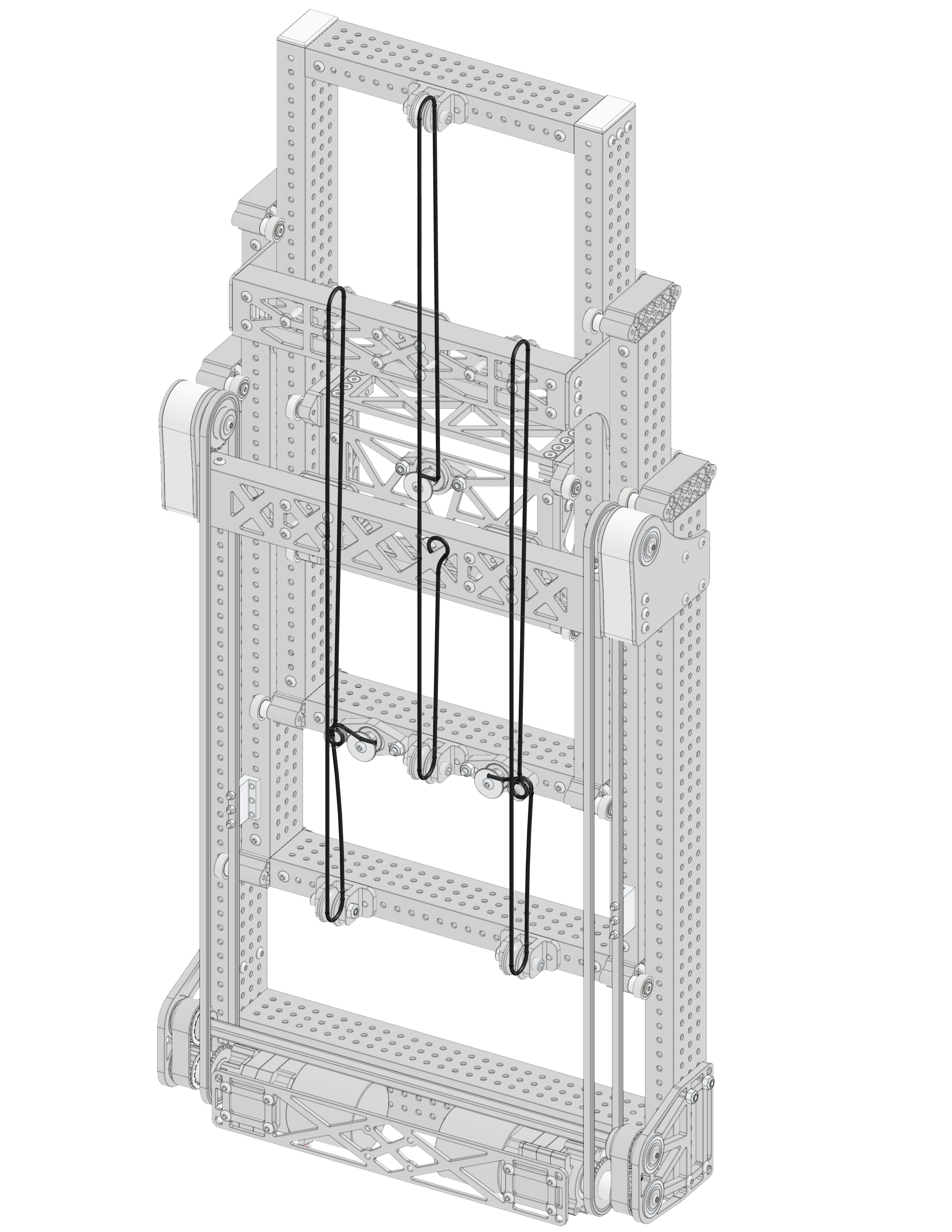 Elevator rigging typically takes up the bulk of the design process, as its the most important part of the elevator. Rigging style, and organization drives the motor mounting, and position of the crossmember the clamp plate is mounted to, so its important to properly plan out the cable paths.