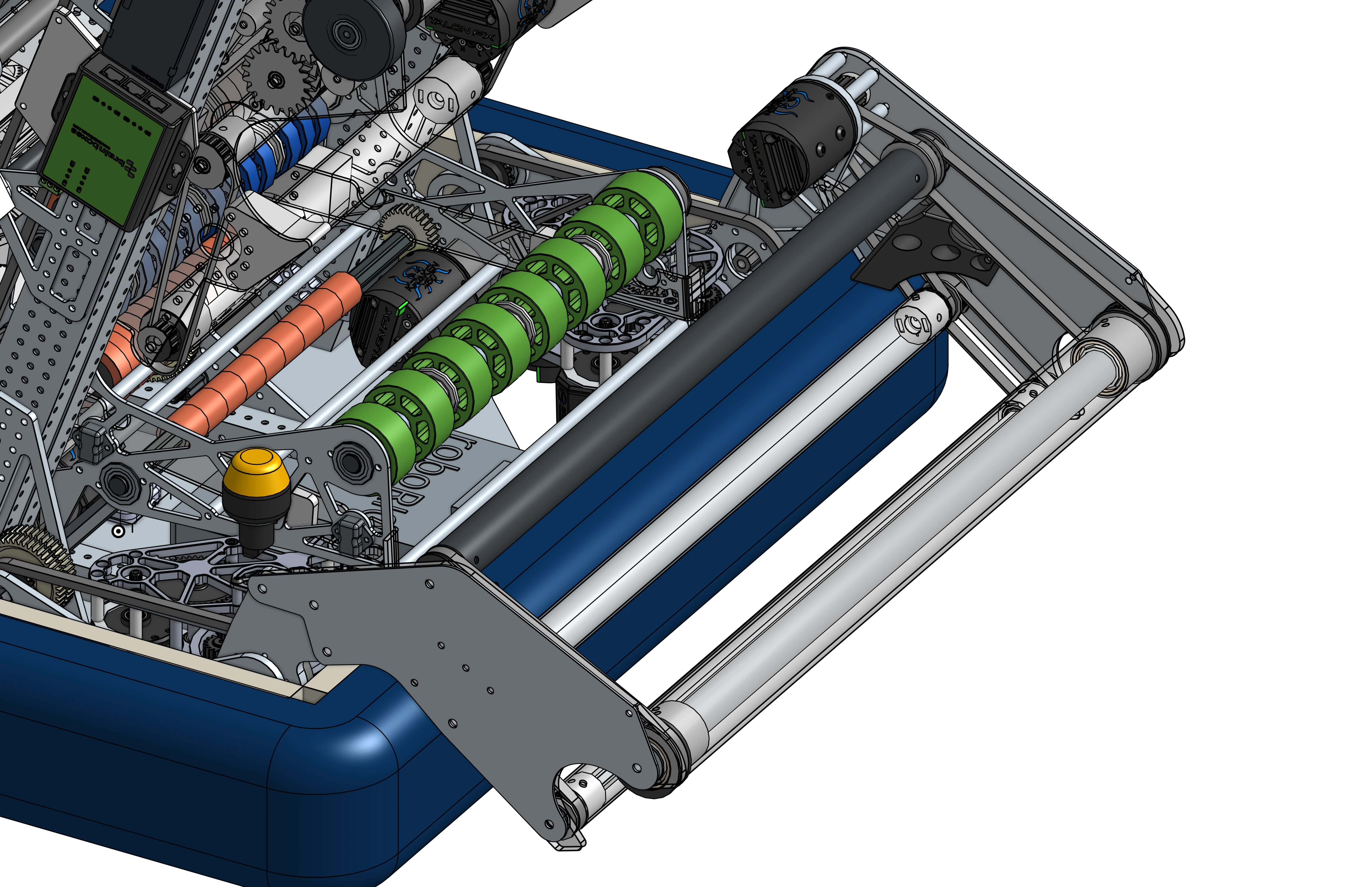 A pneumatically actuated intake with vectoring wheels for centering Infinite Recharge balls